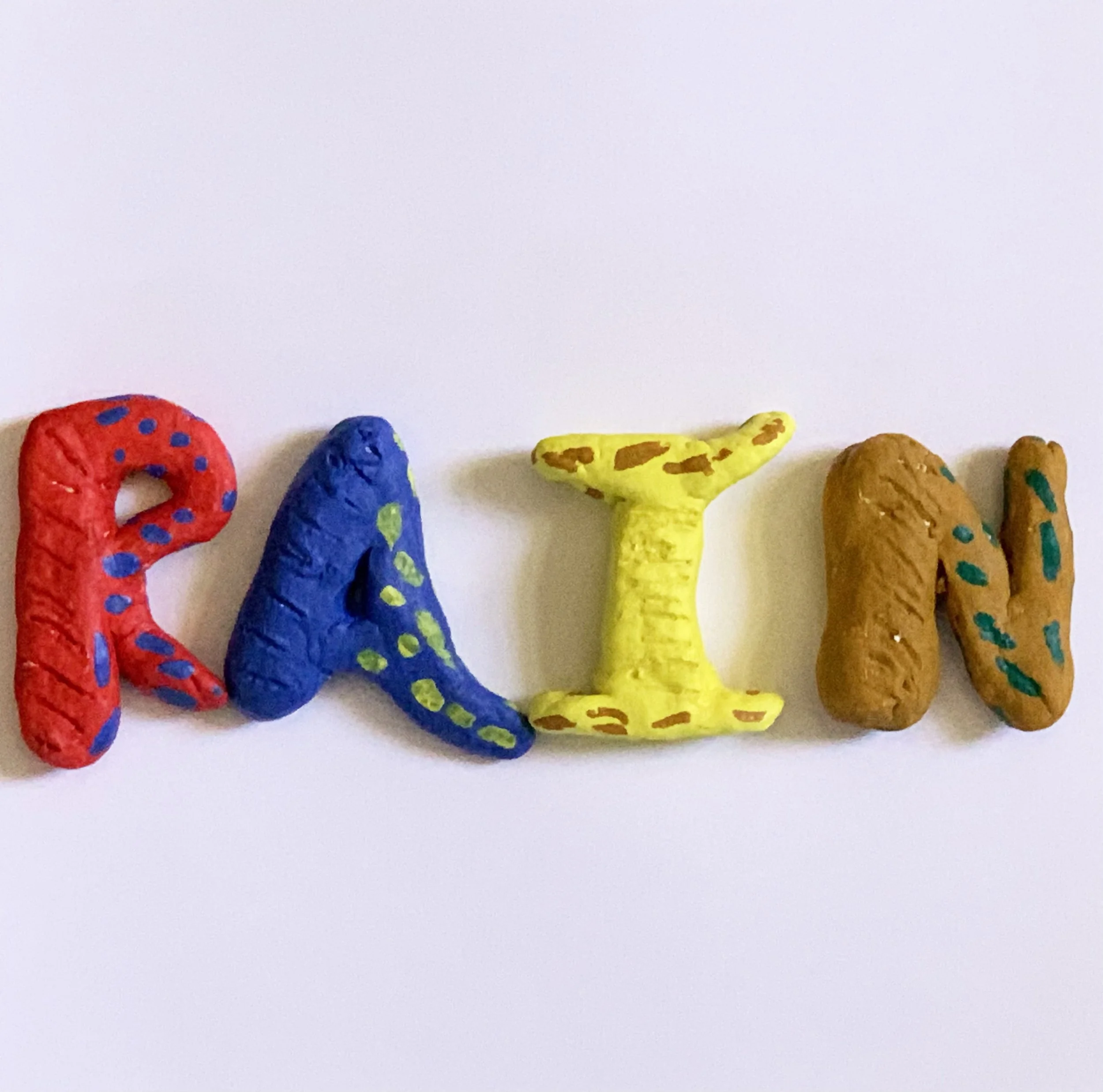 A set of experimental ceramics combining hand lettering to spell the word “ Rain “.