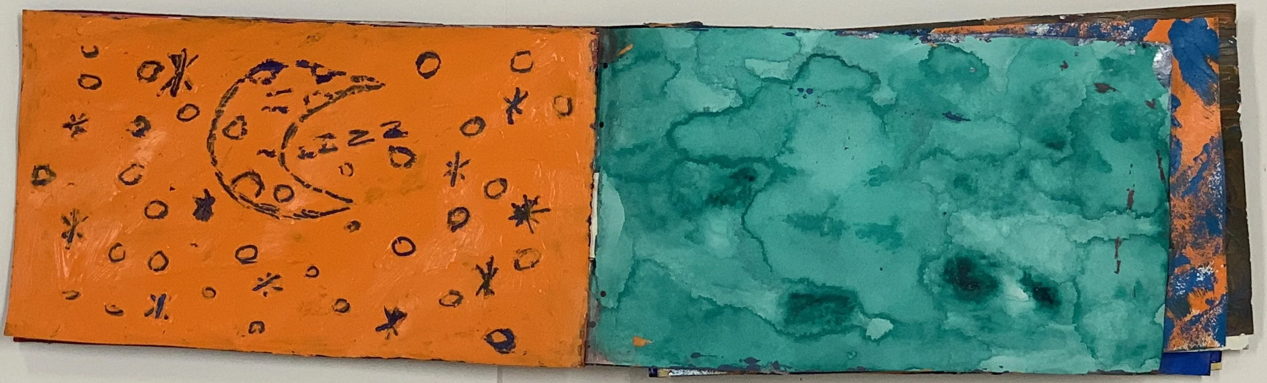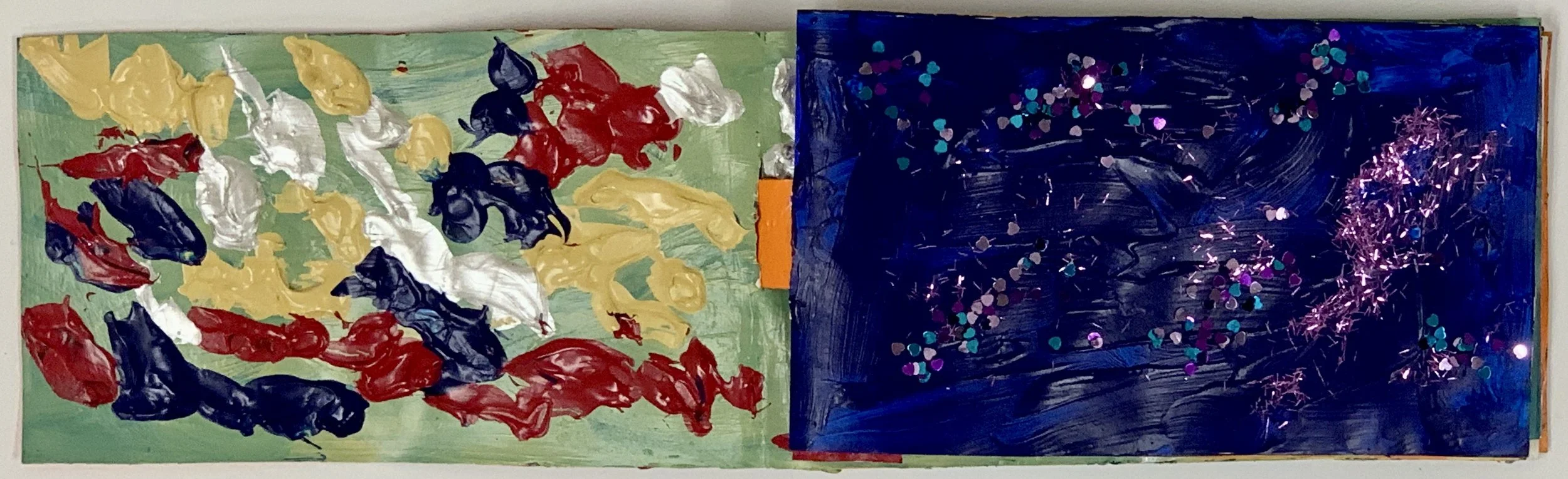 An experimental slot book demonstrating acrylic paint techniques, including ( but not limited to ) ink on paint, sponge painting, and glitter.