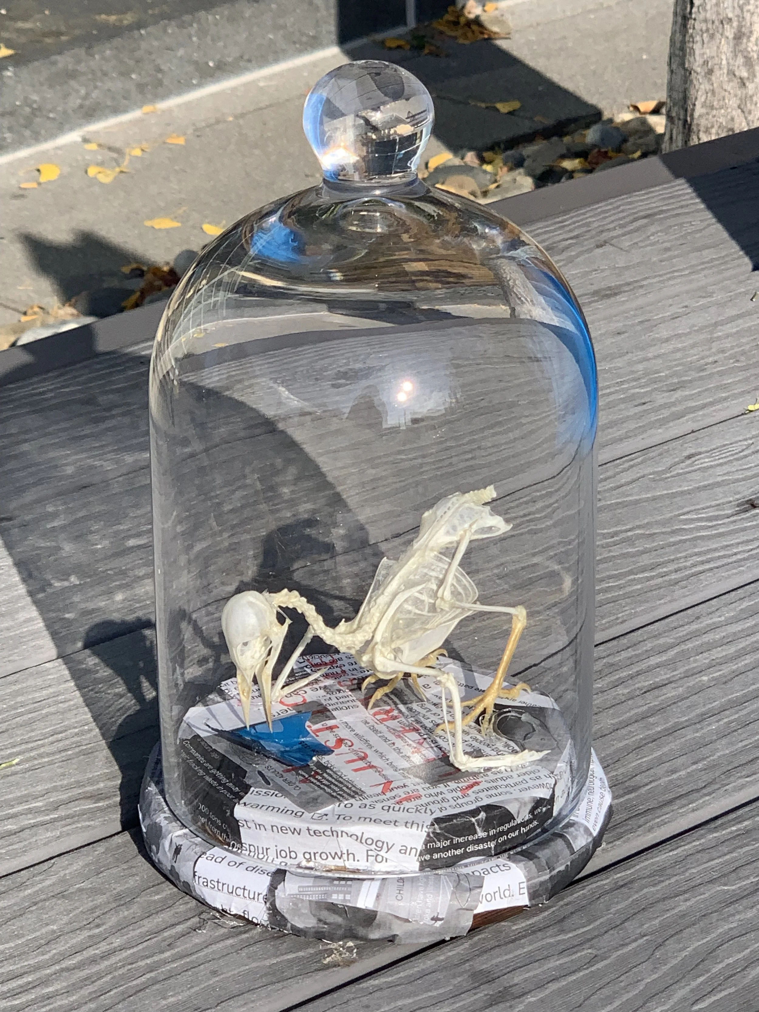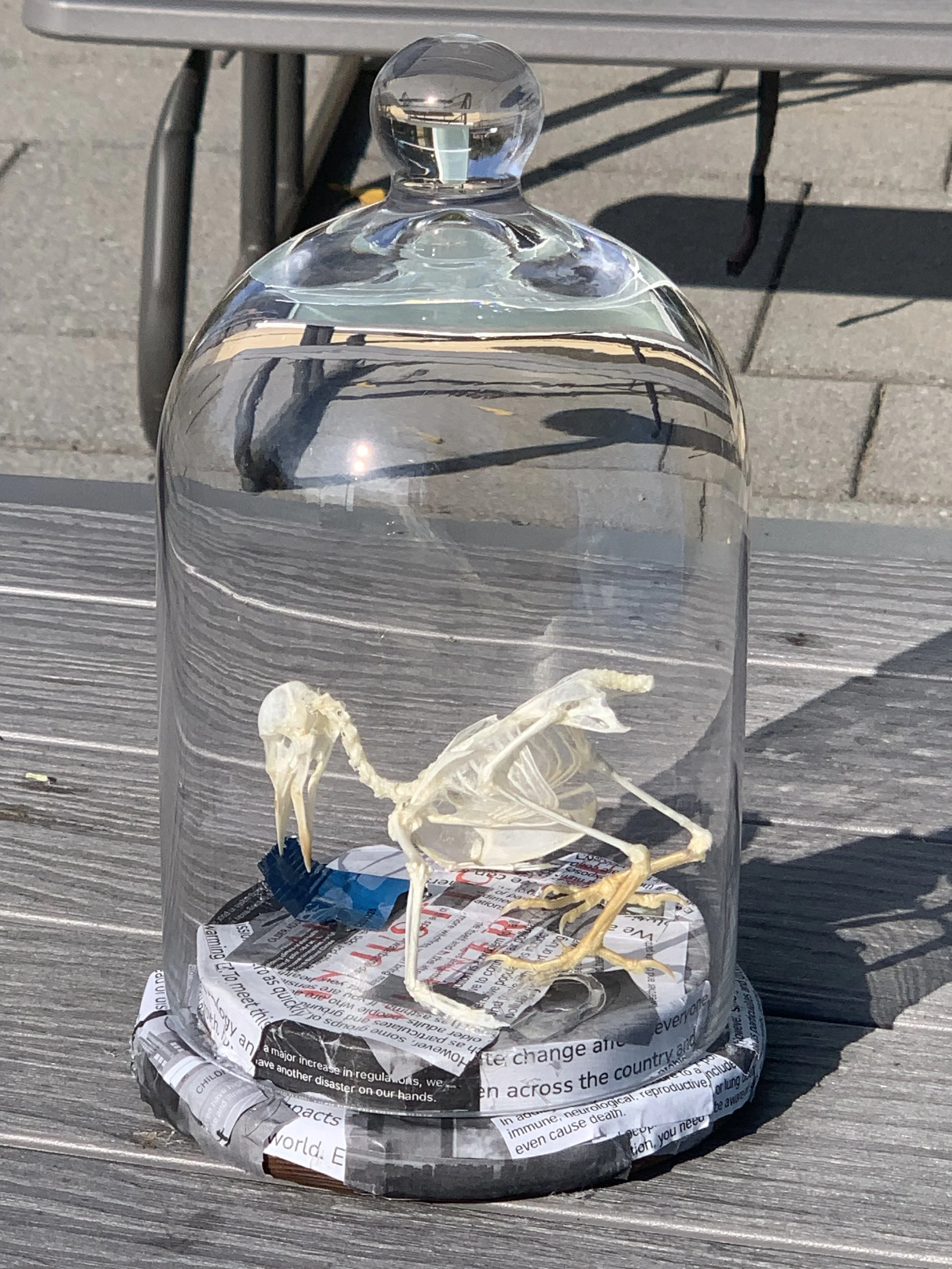 Climate change is the biggest threat to is all, from flora to fauna. Because of the result of abuse of the land for profit, many fauna and flora lives are at risk through cases of increased hurricanes, the risk of cities like Venice being underwater in the near future, and the polar ice caps melting destroying the ecosystems of organisms like Polar Bears and Penguins. I ask the audience, especially climate deniers to look at the pieces of newspaper along with the paradox of a standing skeleton and realize that climate denial is an injustice to every living thing and is something that cannot be tolerated.