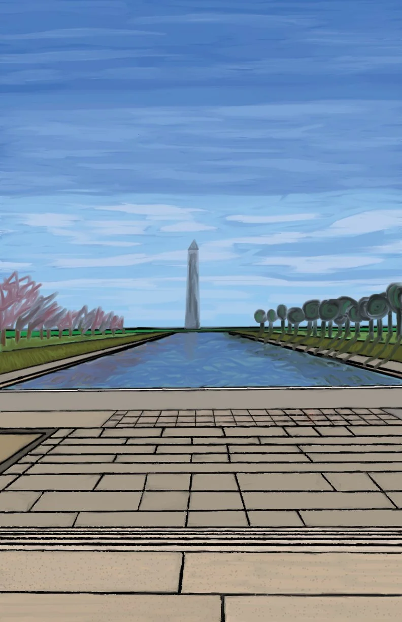 A photoshop painting of the Washington Monument using the mixer brush tool entirely with an emphasis on perspective.