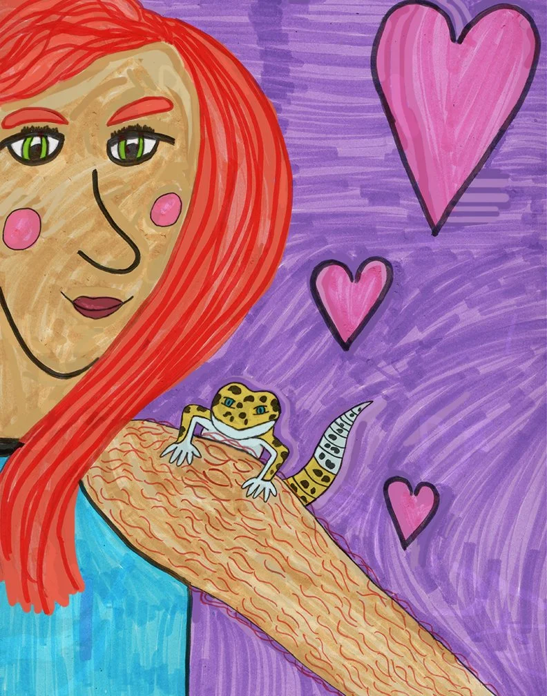 An illustration featuring a woman with her gecko on her shoulder, colored and inked traditionally with brush pen and ink before adding Photoshop touches.
