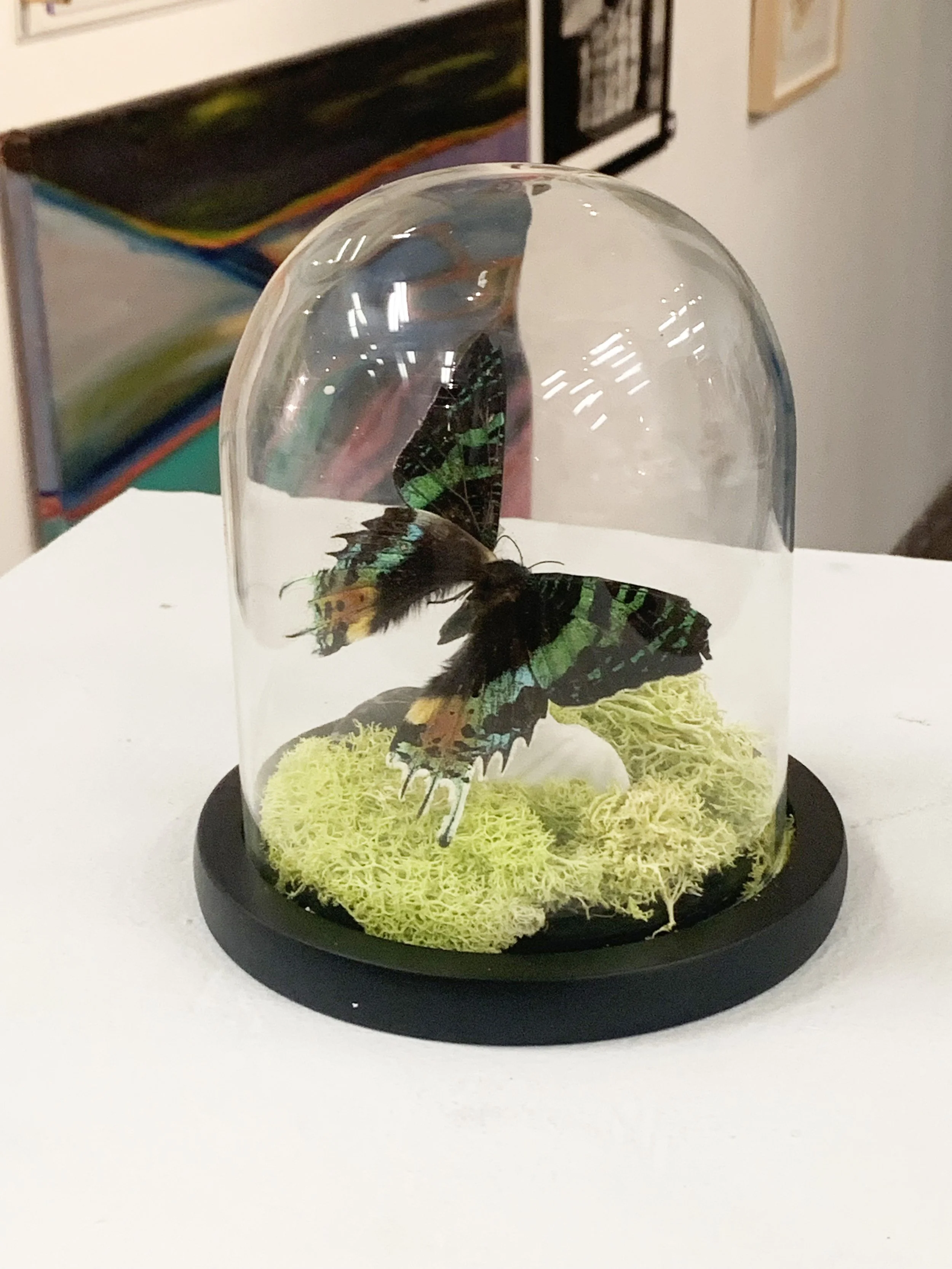 A sunset moth preserved in a dome, with a strong emphasis on capturing the beauty of the wings spread out. I hope the audience can come to appreciate the symmetry, patterns, and size of such a beautiful and fragile creature when preserved in a dome.